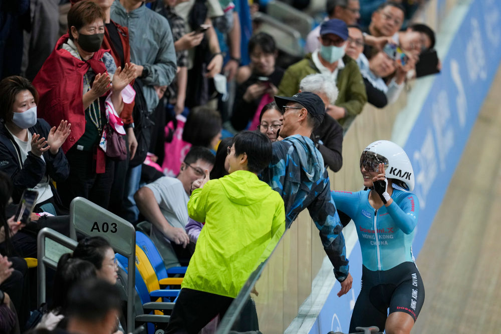 11月17日,香港隊選手李思穎在第十五屆全運會場地自行車女子全能賽后與觀眾合影。新華社記者 吳魯 攝