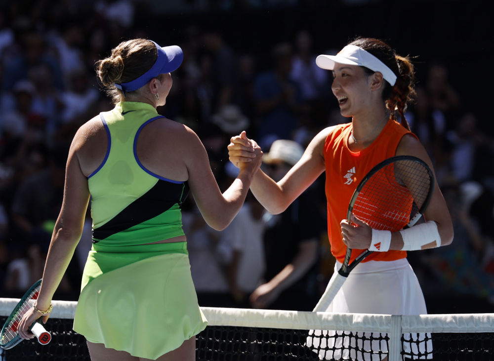 1月26日,王欣瑜(右)與阿尼西莫娃在2026年澳大利亞網球公開賽女單第四輪比賽后握手致意。新華社記者 馬平 攝