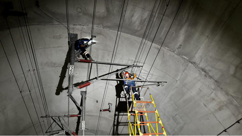 青榮城際鐵路孟家疃隧道內(nèi),頭燈光束劃破黑暗,映出拱頂上一群“蜘蛛人”的身影。他們系緊安全帶,在距地面6米多高的接觸網(wǎng)設(shè)備間攀爬檢修,每一步都關(guān)乎高鐵列車的安全運(yùn)行。