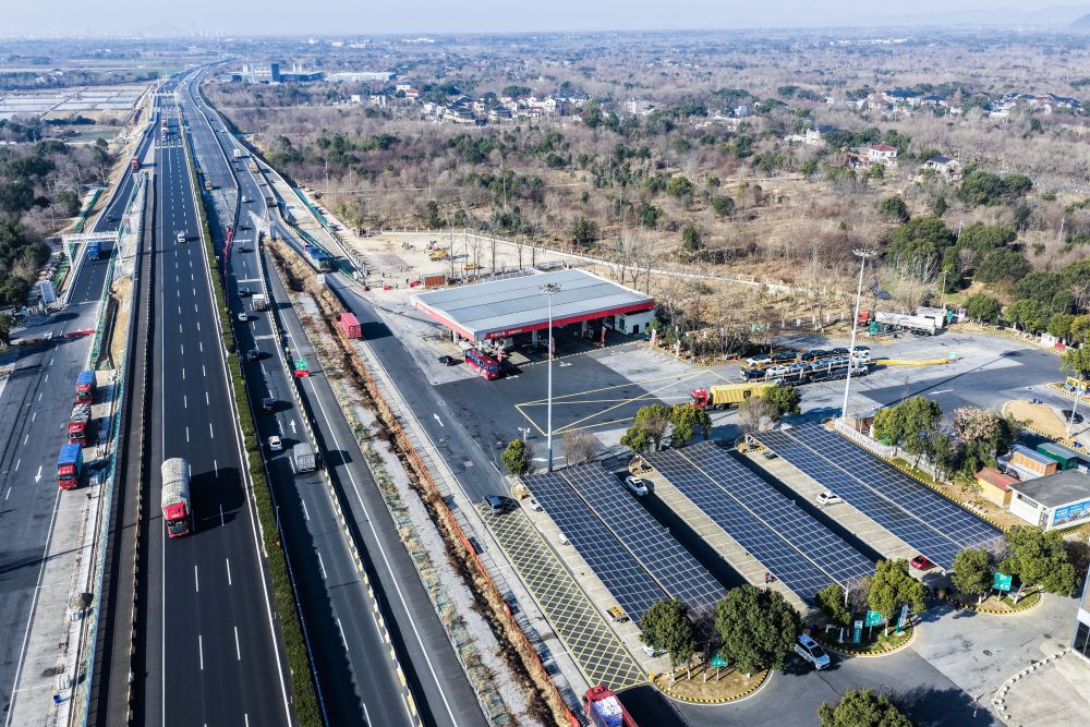 2026年1月7日拍攝的G50滬渝高速長興服務區(無人機照片)。太陽能光伏板下是升級完成的高速服務區充電站。新華社記者 徐昱 攝