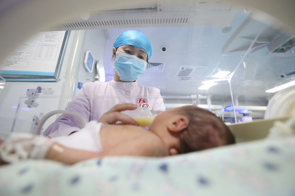 2026年1月1日,在河南省焦作市溫縣婦幼保健院新生兒科,護士為新生兒喂奶。新華社發(徐宏星攝)