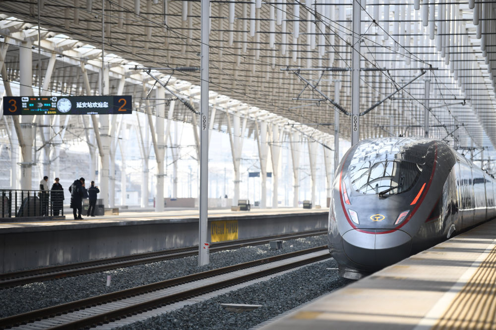 2025年12月26日,西安至延安高鐵開通運營。至此,中國高鐵運營里程突破5萬公里。這是西延高鐵首發列車從延安站駛出。新華社記者 張博文 攝