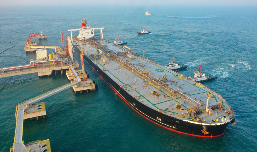 2025年12月18日,一艘裝載著石化原輔料的外籍船舶泊入位于海南省儋州市的國投洋浦油儲碼頭30萬噸級原油泊位(無人機照片)。自2025年12月18日起,海南自由貿易港正式啟動全島封關。新華社記者 郭程 攝