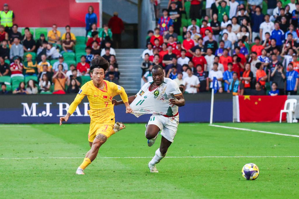 3月31日,在澳大利亞墨爾本舉辦的2026年國際足聯系列賽中,中國隊0:2不敵喀麥隆隊。圖為中國隊球員徐彬(右)在比賽中拼搶。新華社發(金誠攝)