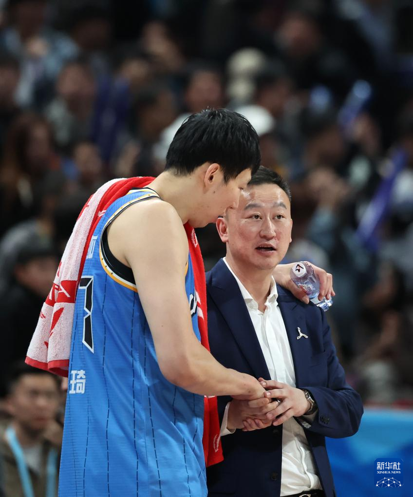 4月14日,青島嶗山啤酒隊(duì)主教練劉維偉(右)賽后與北京北汽隊(duì)球員周琦交談。