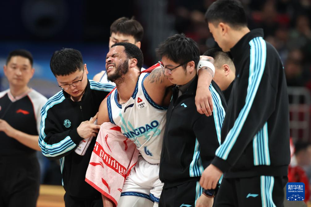 4月14日,青島嶗山啤酒隊(duì)球員韋瑟斯龐(中)在比賽中受傷后被攙扶下場(chǎng)。