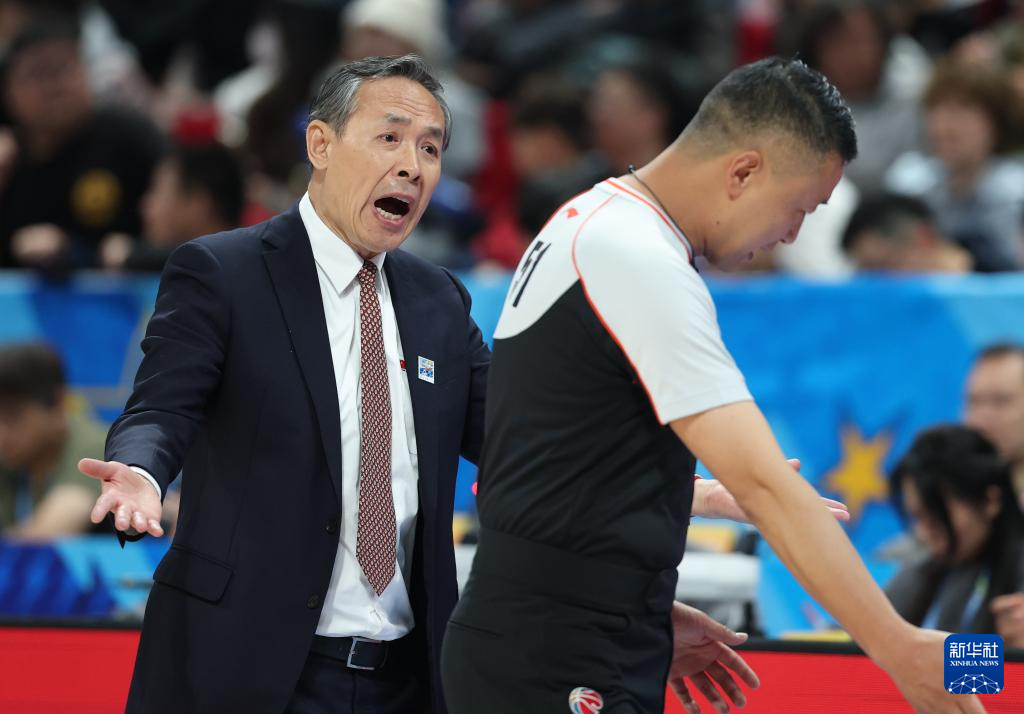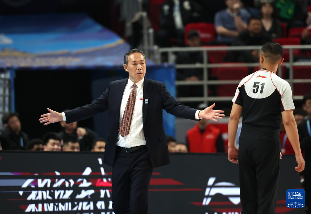 4月14日,北京北汽隊(duì)主教練許利民(左)在比賽中與裁判交流。