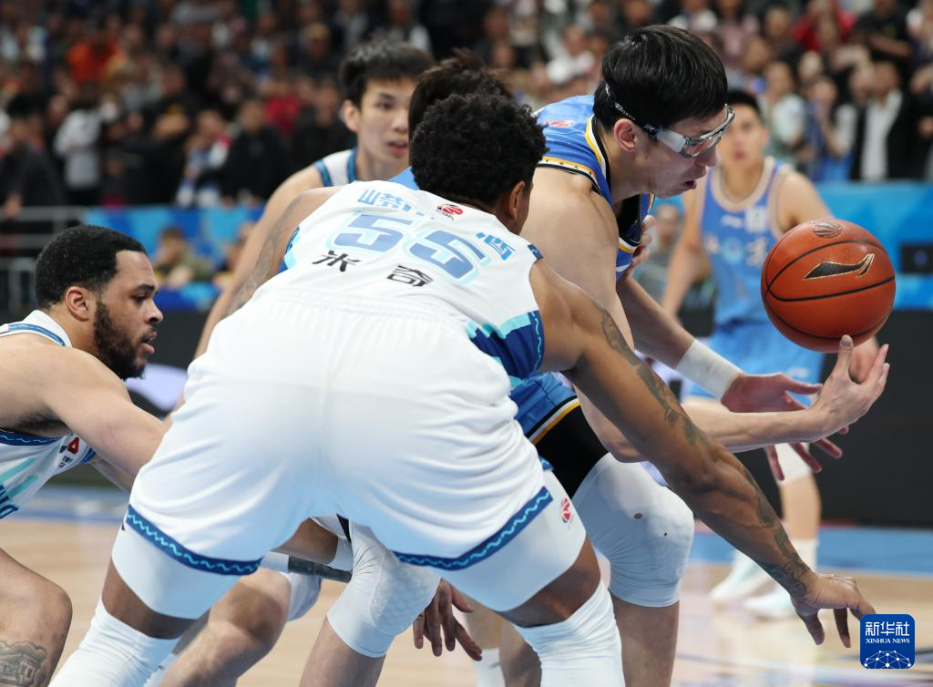 4月14日,北京北汽隊(duì)球員周琦(右一)在比賽中拼搶。