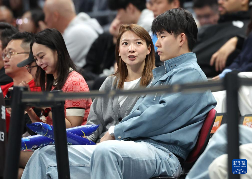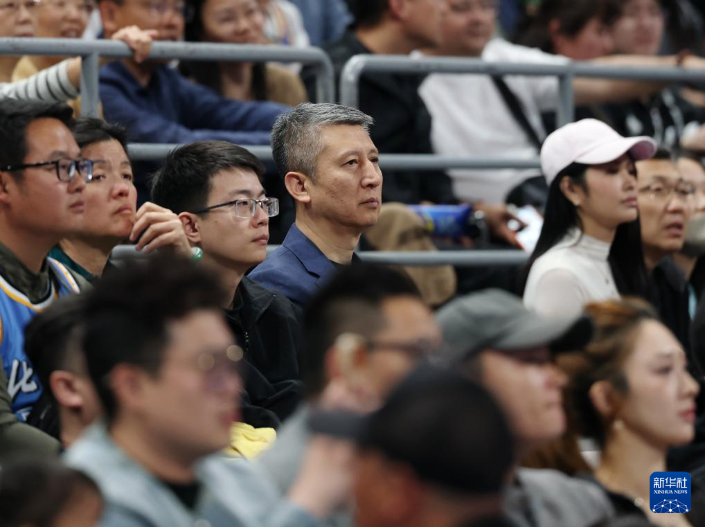 4月14日,中國(guó)國(guó)家男子籃球隊(duì)主教練郭士強(qiáng)(中)在看臺(tái)觀賽。