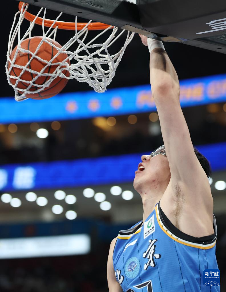 4月14日,北京北汽隊(duì)球員周琦在比賽中扣籃。