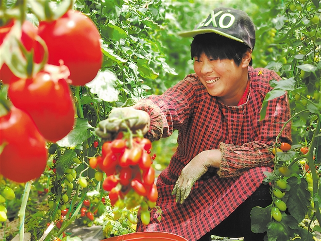 近日,在巨野縣龍堌鎮(zhèn)龍麟現(xiàn)代農(nóng)業(yè)產(chǎn)業(yè)園內(nèi)一瓜果大棚內(nèi),火紅的小番茄掛滿枝頭,萬莊村村民左銀花正忙著采收圣女果(小圖)。據(jù)了解,該產(chǎn)業(yè)園于2017年開工建設(shè),由龍堌鎮(zhèn)整合縣鎮(zhèn)扶貧資金實施建設(shè),總占地2000余畝,建設(shè)高標(biāo)準(zhǔn)日光溫室大棚302棟。目前種植黃瓜、西紅柿、五彩椒等綠色果蔬,采取公司+農(nóng)戶(貧困戶)經(jīng)營模式,將租賃收益的70%用于扶持貧困戶,覆蓋龍堌鎮(zhèn)47個村居900余戶貧困戶,涉及貧困人口1600余人,創(chuàng)造就業(yè)崗位500余個,產(chǎn)業(yè)園在推動農(nóng)業(yè)提質(zhì)增效的同時,也帶動村民和貧困戶共同增收致富。