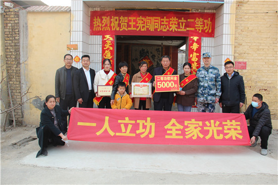 3月22日下午,成武縣人武部、縣退役軍人事務局及文亭街道辦事處相關負責人一行,將一份二等功喜報和慰問金送到了該街道張陳莊現役軍人王憲闖家中,與軍屬共享這份榮耀和喜悅。
