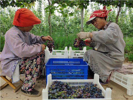 8月14日,在市開發區陳集鎮金碩生態農業園內,葡萄園迎來收獲季,村民們正在分揀裝箱。金碩生態農業園因地制宜調整農業種植結構,結合實際情況發展以特色種植、生態采摘、旅游觀光為亮點的休閑觀光生態農業,對園區耕地全部實施了水肥一體化,著力打造200多畝生態葡萄采摘園,搭建5000多米的葡萄長廊,為附近農民拓寬致富增收的道路。