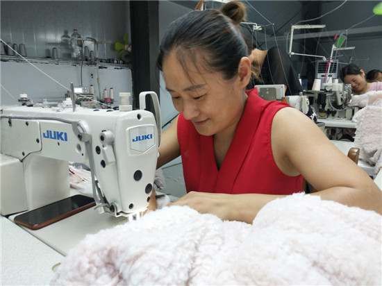 8月21日,定陶區天中街道辦事處鄭莊村扶貧車間內,村民王友娟正在嫻熟地趕制著出口的套頭衫。“自從有了扶貧車間,在家門口上班也能月收入3000多元了,還能就近照顧家里的小孩老人,別提多方便啦。”王友娟笑著說。目前,該車間共吸納26人實現就業,使她們走上脫貧致富路。 通訊員 宋姝芳 記者 劉衛國