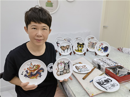 至今,一把把堅硬的工筆刀在韋月香柔弱的指間旋轉(zhuǎn)了20年,一只只各色各樣的瓷盤記載著其青春芳華的無聲夢想。斗轉(zhuǎn)星移、凝眸守望之間,韋月香全身心地徜徉在只有自己才能“陶醉”的叮叮當(dāng)當(dāng)?shù)男鷩淌澜缋铮核诖杀P上以墨書寫、繪畫,接著持刀刻劃、鑿鐫,鉆刀法、雙勾法、刮刀法運用自如,瓷盤表面便形成大小、疏密、深淺不同的“點”的排序,最終構(gòu)成了所需要的畫面或字體,再將雙線間的瓷釉刮去填色……“刻瓷風(fēng)格質(zhì)樸典雅,既能體現(xiàn)傳統(tǒng)書畫藝術(shù)特色,又能保持瓷器表面的晶瑩光潔,形成獨特的藝術(shù)效果。”韋月香手語。