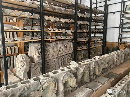 “這些物件有瓦當、滴水、陶器和磚塑,大多數都是靠從房屋拆遷廢墟、牲畜圈內、廁所、垃圾堆里等地‘撿’回來的,沒少費了心思。”指著架上的舊物件,鄭杰介紹說,“常見的有雙獅、為人民服務、寓意福氣,還有壽桃、梅花鹿、祥云,再精致一些的,有二龍戲珠、龍鳳呈祥等。”筆者看到,歷經歲月的磨礪,這些物件的棱角大多已不同程度風化,可圖案、文字卻基本清晰可見。