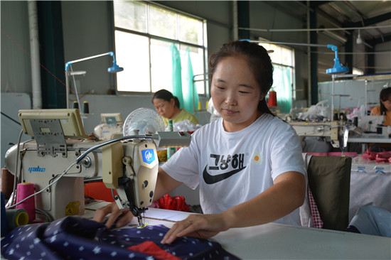 “早晚接送孩子,白天在家門口務(wù)工;農(nóng)忙時在家育秧下種,農(nóng)閑時在工地掙錢養(yǎng)家。家里有人照顧,打工也有收入,不用出遠(yuǎn)門就能掙到錢。”8月11日下午,在鵓鴿堂村村頭的一個服裝加工車間里,村民武秀菊一邊操作著機器加工衣物,一邊向記者介紹工作的情況。