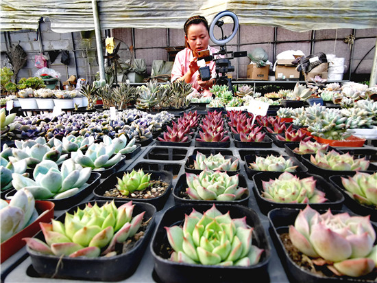 “現(xiàn)在俺村種植的多肉品種達(dá)到300多個,年產(chǎn)多肉100萬株,每年產(chǎn)值超百萬元。”姚顯坤介紹,現(xiàn)在依托直播銷售模式,他3個月的時間就賣出了1000多株多肉,收入近2萬元,不少村民放下鋤頭,拿起手機(jī),當(dāng)起了主播。