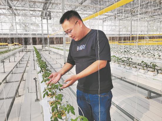 在孫繼兵的帶領(lǐng)下,記者來到恒然生態(tài)園,在6000多平方米智能溫室大棚內(nèi),一棵棵番茄苗正在茁壯生長。與傳統(tǒng)種植方式不同的是,這里看不到一丁點兒土壤,取而代之的是密密麻麻排列著的栽培架,只見一棵棵嫩綠的番茄秧苗扎根于一塊塊巖棉里,它們生長所需要的水肥,都是通過一根管道供應(yīng),科技范兒十足。