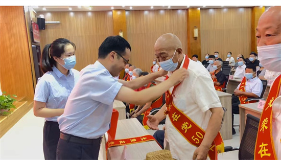 6月28日,中共岳程街道工作委員會“光榮在黨五十年”紀念章頒發(fā)儀式舉行,岳程街道黨工委書記劉自坤為老黨員頒發(fā)紀念章。“我22歲入黨,黨齡五十年了,雖然年紀大了,但是我的思想不老,今后我要緊跟黨中央的步伐,為辦事處、社區(qū)的工作發(fā)光發(fā)熱。”來自何莊社區(qū)的老黨員顧守金激動地說。“作為一名今年剛入黨的新黨員,今天能來見證這個儀式備受鼓舞,今后我要接過老黨員的接力棒,秉承為人民服務的初心投入到工作中。”新黨員代表張?zhí)齑T表示。