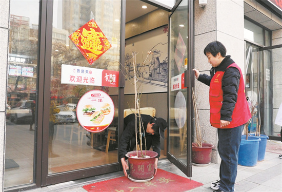 3月6日,牡丹區南城街道辦事處組織執法人員重點針對轄區店外占道經營行為進行全面整治。此次整治,重點對中和路、西安路等路段門面經營、流動攤販進行整治。行動中,執法人員通過與門面經營戶、流動攤販進行溝通交流,耐心講解整治占道經營的意義和要求,勸其入店經營、入市經營,贏得當事人的支持與配合。圖為志愿者正在規勸店家。記者 李若生