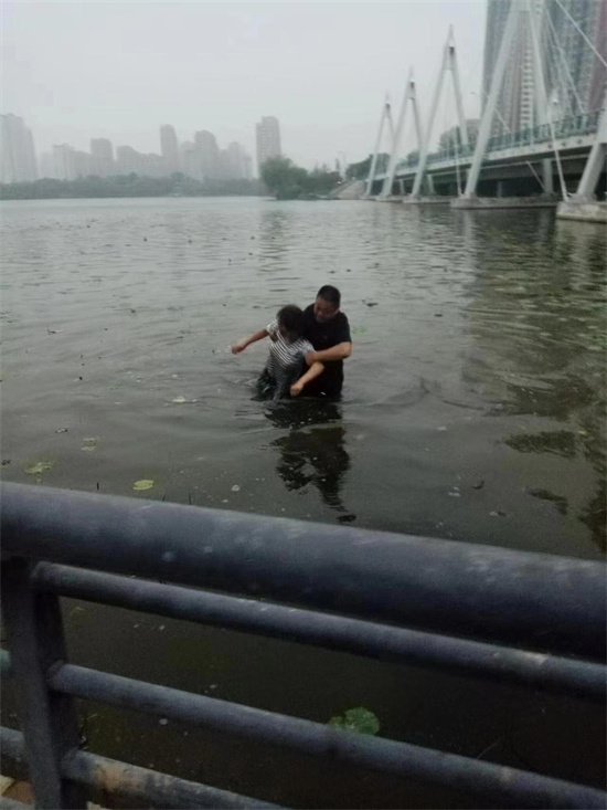 程立建是一名退伍軍人,常年保持著晨跑的習慣。5月18日5時,他和往常一樣在趙王河附近晨跑,當跑至長城路橋南側時,看見一名30多歲的女子坐在岸邊,雙腿浸泡在水里。女子的行為引起了程立建的注意,他迅速走下臺階,朝女子走去。“女子突然跳入河中,向河中央走去,岸邊有3位晨練的大爺勸阻,女子根本不回頭。”程立建告訴牡丹晚報全媒體記者,情況緊急,他唯一的想法就是救人,當他跨過岸邊的護欄時,女子已離岸兩三米遠,河水淹沒了她上半身。程立建來不及脫掉衣服和鞋子,縱身跳入水中,他一邊呼喊,一邊奮力走向落水女子,當他走到女子身邊時,兩個人已距離岸邊四五米遠,水深及胸。