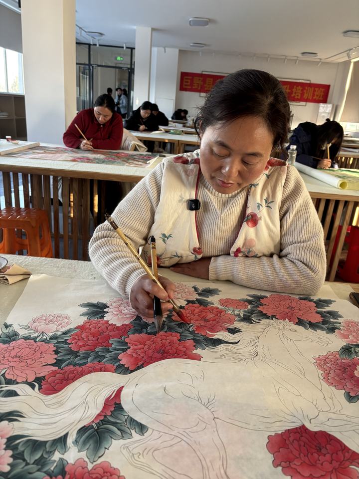 巨野工筆牡丹畫知名度頗高,全國(guó)80%工筆牡丹畫出自當(dāng)?shù)兀鳟嬙寒嬶L(fēng)迥異,涵蓋傳統(tǒng)、新畫法及中西結(jié)合風(fēng)格,吸引各地客商選購(gòu),片區(qū)建設(shè)更是推動(dòng)了產(chǎn)業(yè)整體發(fā)展。“工筆牡丹畫看似簡(jiǎn)單,實(shí)則創(chuàng)作周期長(zhǎng),培育畫師就像‘十月懷胎,一朝分娩’,需經(jīng)長(zhǎng)期基礎(chǔ)培訓(xùn),畫好且形成自身風(fēng)格更難,沒(méi)法像企業(yè)那樣快速盈利。”徐鳳秋坦言,正是這份長(zhǎng)期堅(jiān)守,讓書畫院成為鄉(xiāng)村振興的重要力量——不僅讓寶媽們擺脫“兩點(diǎn)一線”的低落狀態(tài),實(shí)現(xiàn)“一手拿鋤頭,一手拿畫筆”的幸福生活,部分學(xué)員學(xué)成后還帶動(dòng)周邊寶媽創(chuàng)業(yè),讓“我媽是畫家”成為孩子驕傲的宣言。