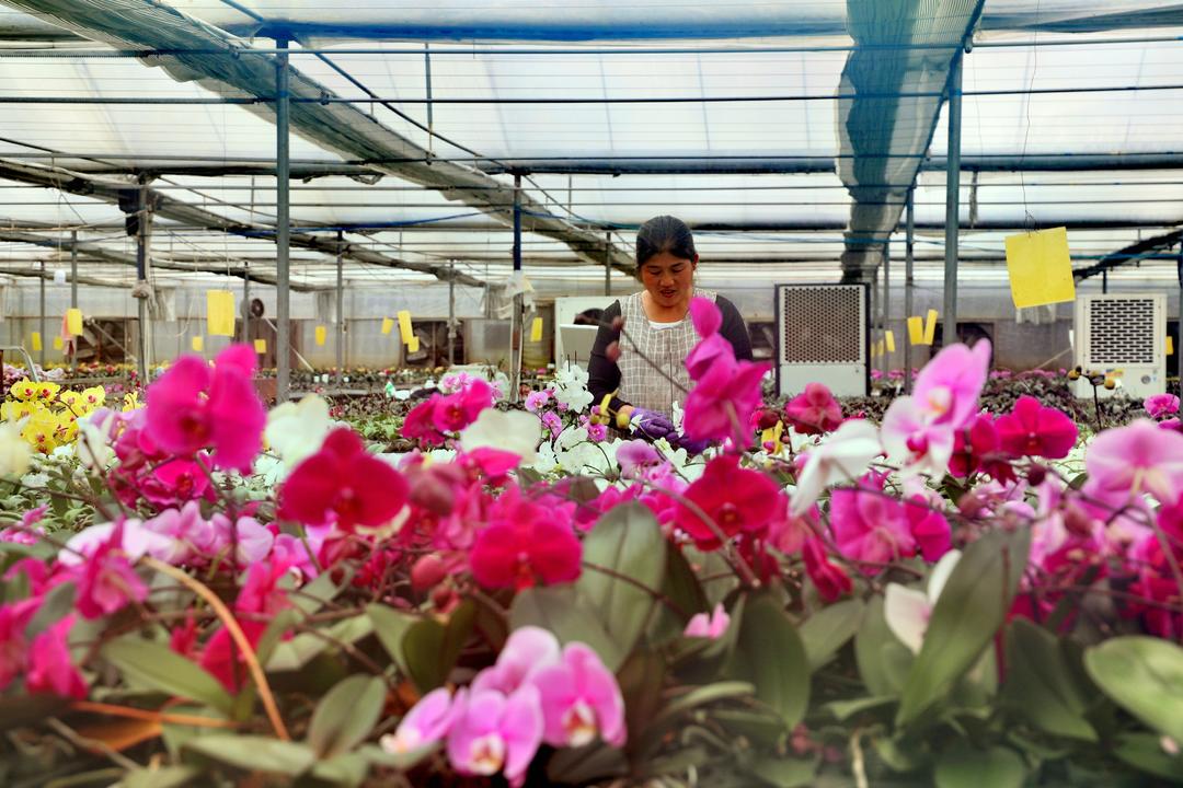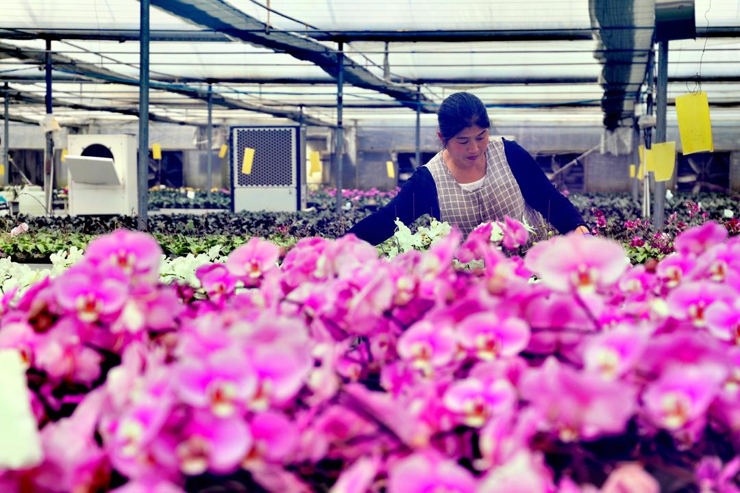 大棚里,粉白、玫紅的蝴蝶蘭亭亭玉立,工人們分工有序——有的給幼苗換盆,有的為盛開的花枝塑形。來自竇樓村的張艷玲正打理著一株“滿天紅”蝴蝶蘭,她笑著說:“中午管飯,一個月3000多塊,在家門口就能掙錢,還能照顧老人孩子。”