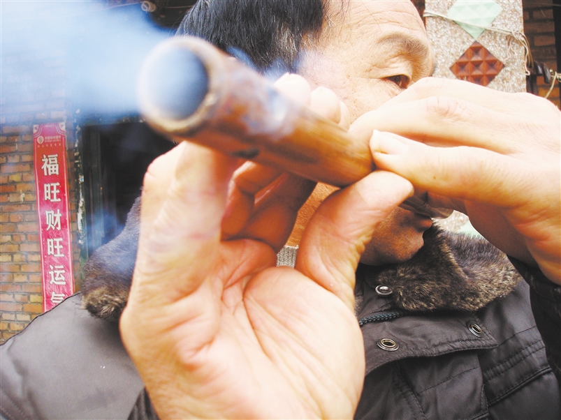 “吃龍火”是田向東的“拿手好戲”:火苗吞到嘴里,嗩吶哨片在舌頭上“鳴叫”,交替不斷,火鳴不迭,真可謂聲情并茂,驚心動魄。“開始練習鼻穿釘時,釘子蹭地鼻孔直癢癢,連打噴嚏。也就是因為難學,很多人都半途而廢了。”