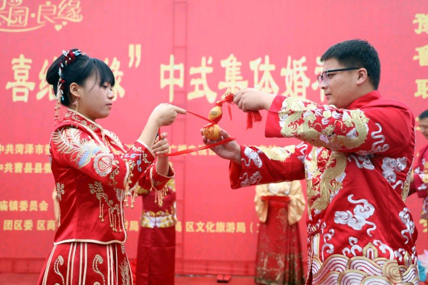 9月27日,山東省菏澤市曹縣與河南省商丘市梁園區(qū)同步聯(lián)動,舉辦“曹韻新風(fēng)·花好月圓”2025年新時代文明實踐中式集體婚禮。