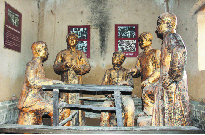 袁心來興致勃勃地帶領(lǐng)記者參觀村里的金曹縣抗日民主政府舊址。高大古槐掩映下的古樸院落,顯得格外幽靜。走進(jìn)修繕的老屋里,一座銅色群雕首先映入眼簾,5個(gè)壯實(shí)人物的英雄形象,令人肅然起敬,或講述、或聆聽、或沉思,無所畏懼、豪邁坦蕩的神情凝在聚每個(gè)人物的臉龐。袁心來講解道:“這是中共單東北第一個(gè)農(nóng)村黨支部成立的地方,再現(xiàn)的是楊作磊家庭黨支部會(huì)議的情景,站著講話的就是黨組織的創(chuàng)始人楊作磊……”