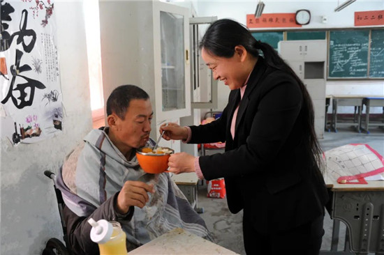 “同學們,下課!”隨著一陣放學鈴聲響起,王艷英結束了上午的三節物理課,和學生們互道再見后,轉身奔向了食堂。拿著打好的飯菜,她未作任何停留,一溜兒小跑又來到了一間空教室,那里有她牽掛的丈夫正坐著輪椅等她歸來。這一幕時常在鄆城縣雙橋鎮初級中學的校園里上演。