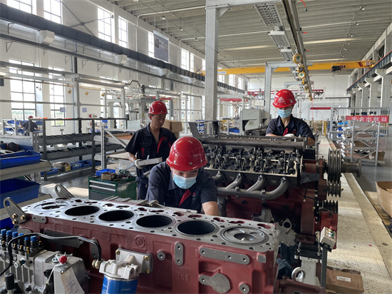 轟鳴的機(jī)械聲為“靜止”多日的菏澤增添了幾分活力。記者進(jìn)入廠房后看到,十余名工人正在熱火朝天地工作,或吊裝機(jī)械,或在智能裝配生產(chǎn)線上有序安裝發(fā)動(dòng)機(jī)及發(fā)電機(jī)組。