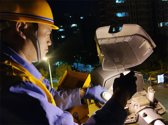 “晚上才是我們最忙碌的時候。”彭軍說。20時許,開著作業車巡邏的幾人一路上打起十分精神,依靠日常巡視工作練就的“火眼金睛”沿途“掃描”,緊盯著路邊的每一盞路燈,恐怕錯過一盞“黑眼燈”。“快看,那里有一盞路燈壞了!”巡邏到市區長城路時,工作人員發現了一盞路燈沒有亮起,就麻利地跳下車,擺路障、引導車流,一名維修人員則迅速跳上工作斗。隨著升降車吊臂的緩緩上升,維修人員很快上升到路燈旁,開始檢修,經過近10分鐘的努力,路燈重新得以安裝并恢復正常照明。