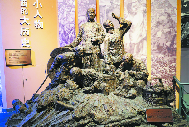 展廳復原了1943年,時任湖西專員的郭影秋在田間為老百姓拉犁的情景。