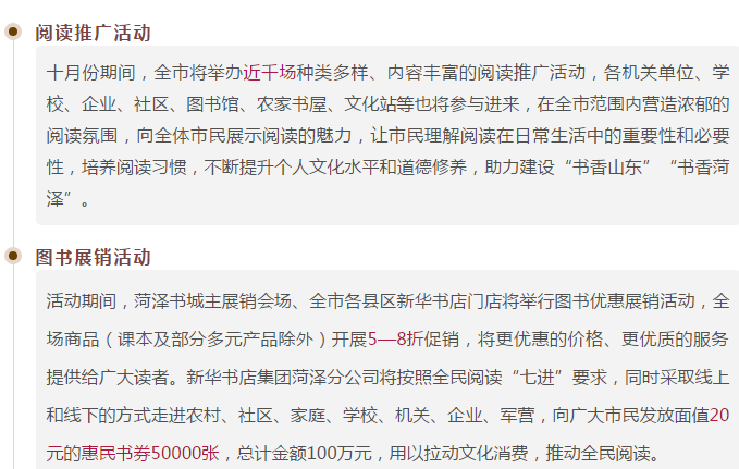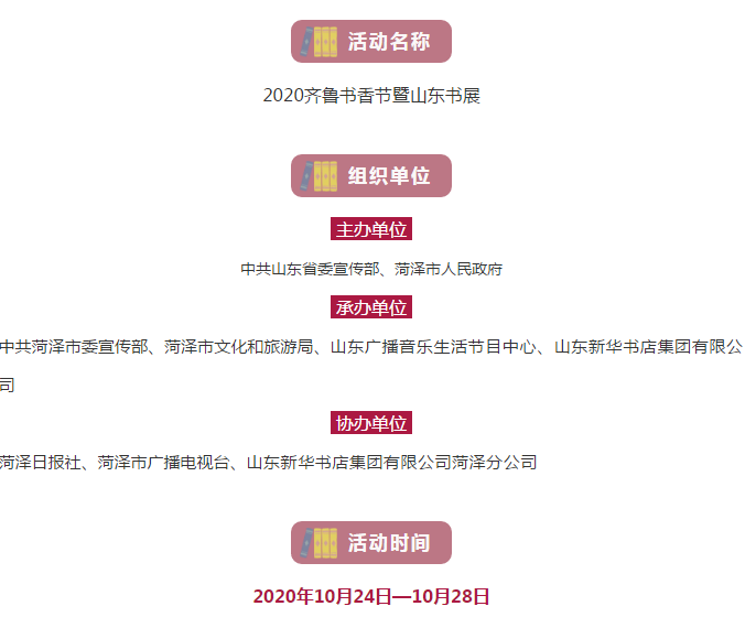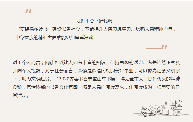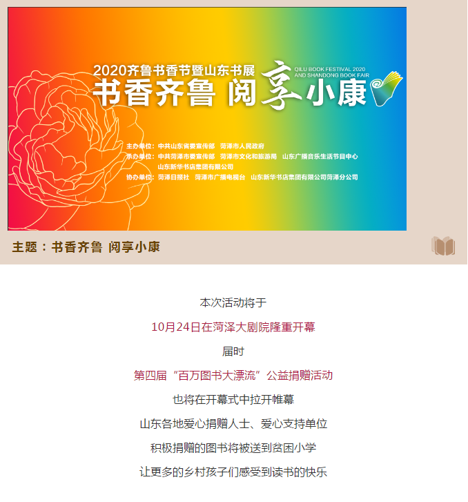 為貫徹落實中央關于開展全民閱讀活動的部署要求,加快建設“書香山東”,助力打贏脫貧攻堅戰,全面建成小康社會,中共山東省委宣傳部、菏澤市人民政府將共同舉辦“2020齊魯書香節暨山東書展”,讓書香在這個收獲的季節彌漫牡丹之都,撒向齊魯大地。