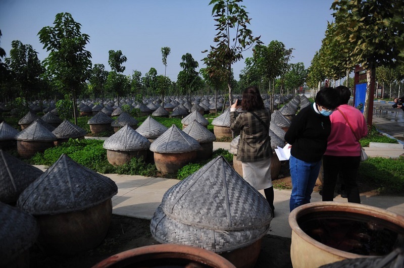 在山東伯樂莊園食品有限公司“林下地缸發酵”示范園,千余口醬缸引起“2020品味山東·全國融媒體菏澤行”采訪團記者的驚呼,第一次見識到如此壯觀的林下地缸發酵技術,記者們興趣盎然,頻頻駐足缸前,聽醬菜師傅講述“成武醬大頭”傳統工藝。