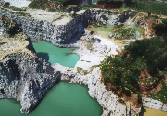 石頭寨往西大約1公里處一處環境優美的“天池”,村民都叫它——白虎山天池。從遠處看,它像一座再普通不過的小山崗的坑塘,一路走上去,才能看到它的“廬山真面目”。白虎山天池不是天然形成的湖泊,而是前幾年附近村民挖到了3眼泉水,因泉眼常年向外噴涌,目前,天池南北3公里長,水面達600多畝,最深處40多米。站在“天池”上向下看,人造青巖絕壁,雖截面整齊但亦嶙峋突兀,峭壁聳翠,基巖裸體,謂為壯觀;天池水色清澈,周圍的巖礫、砂石被染成紅褐黃綠、深淺不一的顏色,溝壑參差俏麗,峰群一字從南向北排列,在氤氳的水氣中,閃爍著五光十色的光芒。