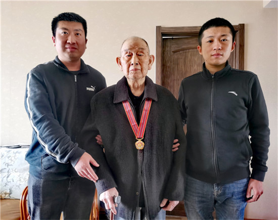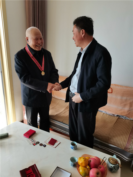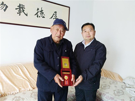 圖③定陶區組織部副部長鄭洪生、定陶區退役軍人事務局局長胡天亮(右)一行為抗美援朝作戰老兵頒發抗美援朝70周年紀念章