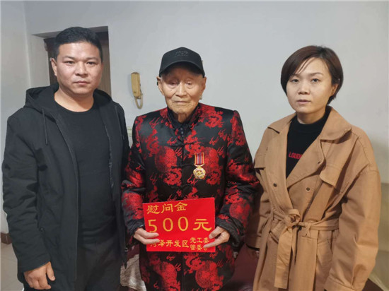 圖②單縣縣委副書記、縣長張慶國(左2)、單縣退役軍人事務局局長施林倩(女),為抗美援朝老戰士送去了慰問品、慰問信,并頒發了中國人民志愿軍抗美援朝出國作戰70周年紀念章