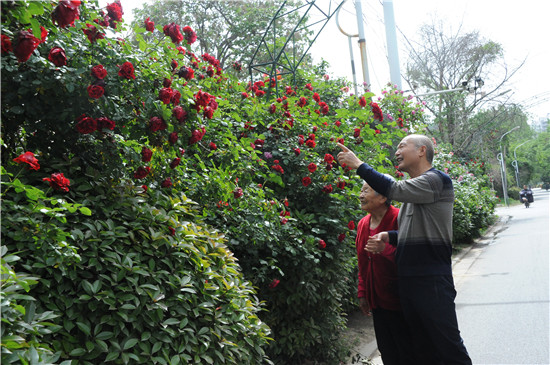 5月6日,牡丹晚報全媒體記者來到市和平路牡丹嘉園小區(qū)南側(cè),見躍出圍墻的薔薇花開正艷,一簇簇花朵沐浴著明媚的陽光隨風(fēng)起舞,成為一道亮麗的風(fēng)景。在此經(jīng)過的市民紛紛駐足觀賞,將美麗的花定格在手機相冊里。“這里花開得正好,我陪80多歲的母親在這里散步,母親總會露出幸福的笑容。”市民張先生說,他住在市人民路龍燕陽光城小區(qū),天氣晴好時經(jīng)常領(lǐng)著母親在此處賞花、散步。
