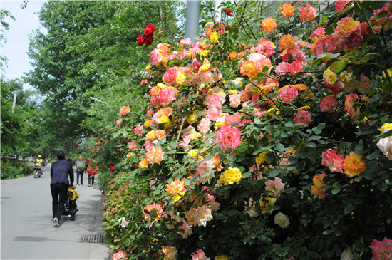 在菏澤煙草家屬院的圍墻處,多色的薔薇花尤其吸人眼球,乳白、鵝黃、金黃、粉紅等多種顏色沁人心脾,朵朵芬芳馥郁,引來市民駐足觀賞。除了薔薇花,月季花也在盡情怒放,絢麗多彩,姹紫嫣紅,開得喜慶而熱鬧。