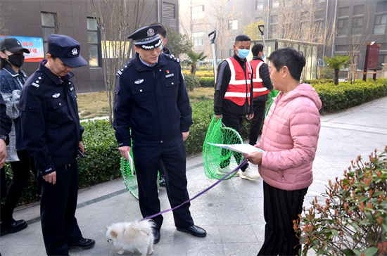 3月5日,根據市委、市政府文明城市創建工作統一部署,市文明辦聯合市公安局、市城市管理局、市住建局,組織魯西公安分局、魯西城管執法隊開展不文明養犬行為集中整治行動,重點對遛狗不拴繩、養犬不登記、不及時清理犬只排泄物行為進行治理,對大型犬、烈性犬、流浪犬進行集中收容。活動當天,對天香公園晨練市民群眾進行了養犬管理普法講解,對周邊流浪犬進行了收容,對中達廣場小區一期不文明養犬行為進行了集中整治。截至目前,全市已收容各類犬只310只,辦理犬牌犬證1605個。圖為執法人員向群眾宣傳講解《菏澤市養犬管理條例》。記者 時蘇建 攝