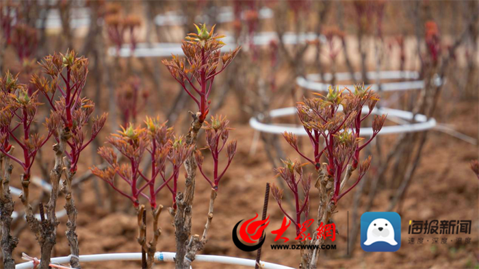 2022年于山東青島移植的“雙生”牡丹古樹,伴隨著春風吹拂,“吐”出來嫩嫩的新芽;據管理人員介紹,目前牡丹古樹長勢良好,今年可開花。