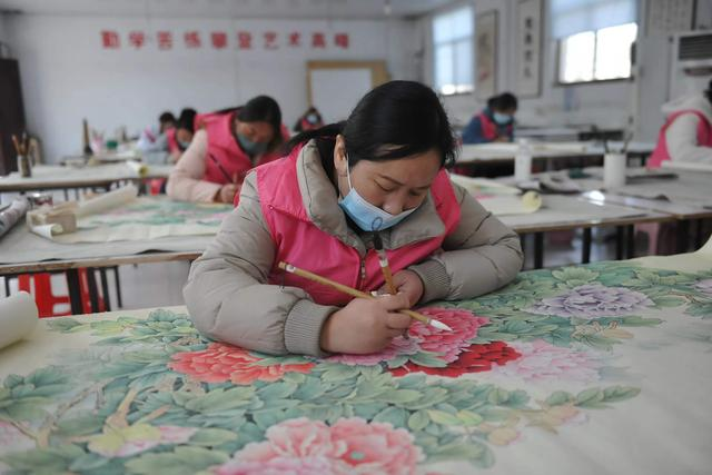 前文提到,工筆畫出自巨野,這里是“中國農民繪畫之鄉”。把培育壯大書畫產業與鄉村振興緊密結合,巨野縣建設了書畫示范基地,招募學員時主要以留守婦女和殘疾人等為重點對象,助其通過培訓成為職業畫工,讓其增收致富。