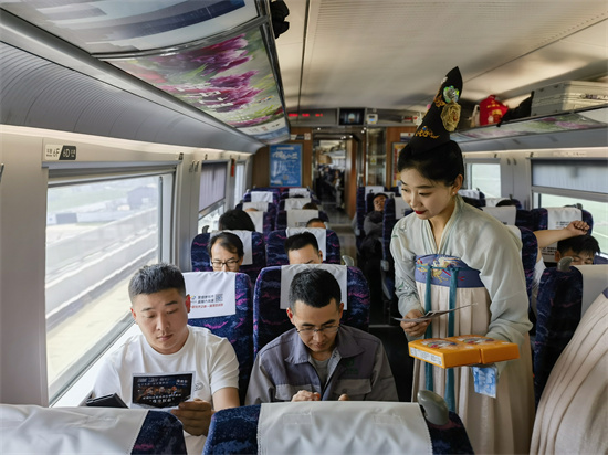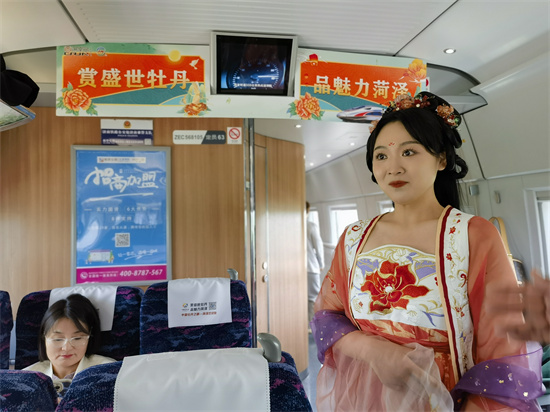數(shù)名乘務(wù)員身穿漢服、懷抱菏澤特產(chǎn)在車廂內(nèi)進(jìn)行宣傳,牡丹飴、罐子湯等各類產(chǎn)品陸續(xù)免費(fèi)兌換給乘客,每節(jié)車廂內(nèi)都洋溢著喜悅的氛圍。乘務(wù)人員還為乘客們表演了快板書等節(jié)目,贈(zèng)送了菏澤牡丹開發(fā)企業(yè)提供的牡丹鮮切花和牡丹氣泡水。
