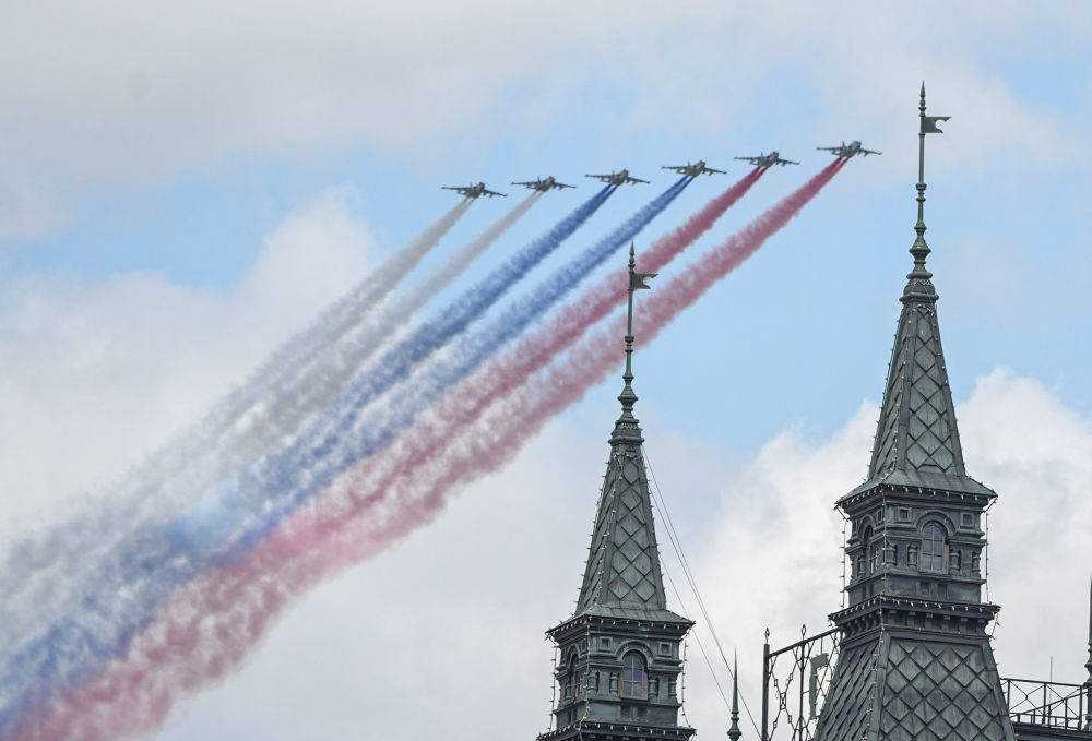 克里姆林宮斯巴斯基鐘樓上,巨大的自鳴鐘指針指向10時,悠揚的鐘聲響徹紅場。俄羅斯軍樂隊奏響《神圣的戰爭》樂曲,儀仗隊護衛俄羅斯國旗、偉大衛國戰爭勝利旗入場。