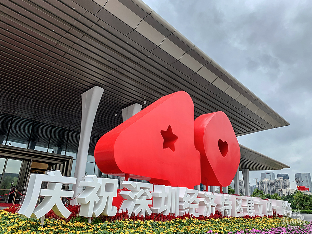“40”是慶祝大會當天最醒目、設計最獨特的數字。4里面是一顆五角星,取自五星紅旗,0里面是一顆愛心,這個標識的名字叫做“星心相映”,寓意著深圳是一顆明日之星,也是一座愛心之城。(總臺央視記者程鋮拍攝)