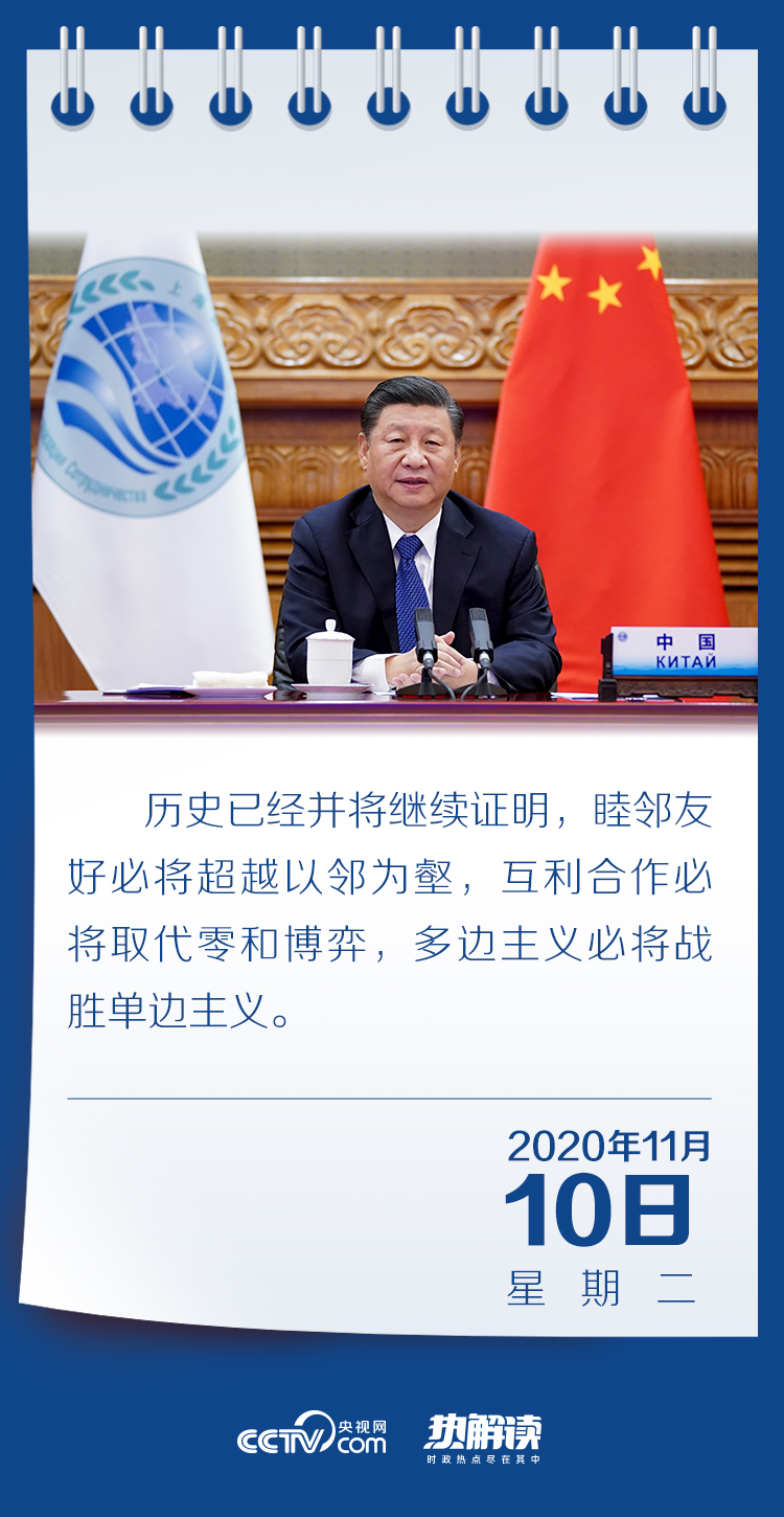 11月10日晚,習近平主席以視頻方式出席上海合作組織成員國元首理事會第二十次會議,并發(fā)表題為《弘揚“上海精神” 深化團結(jié)協(xié)作 構(gòu)建更加緊密的命運共同體》的重要講話。