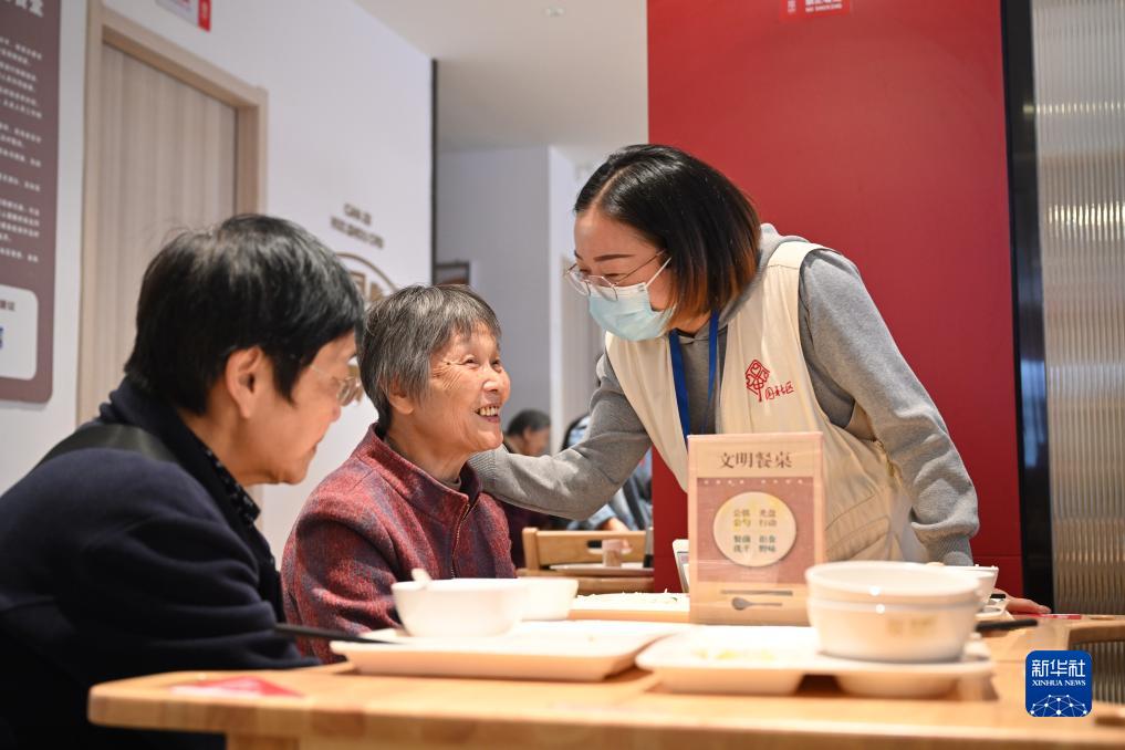 2023年11月16日,社區(qū)工作人員在福州市鼓樓區(qū)慶城社區(qū)長者食堂內與用餐老人交流。新華社記者 姜克紅 攝